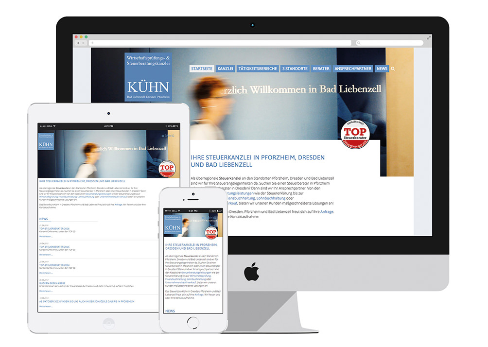 weitzeldesign realisierte den responsiven Internetauftritt der Wirtschaftsprüfungs- und Steuerberaterkanzlei Kühn mit den Standorten Bad Liebenzell, Pforzheim und Dresden.